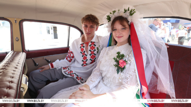 Побач з экспазіцыяй - легендарная "Волга" 70-х гадоў колеру спелай вішні. Некалі такі аўтамабіль на вяселлі быў прыкметай дастатку. Сёння ж яна стала часткай экспазіцыі, гарманічна ўпісаўшыся ў атмасферу, дзе кожная дэталь - гэта адсылка да нечай шчаслівай даты ў мінулым.