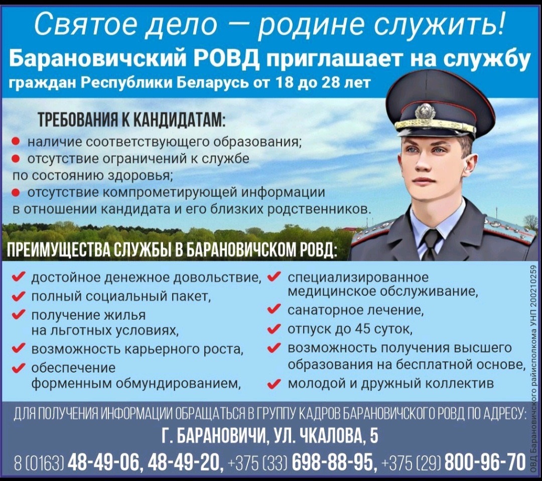 Барановичский РОВД приглашает на службу граждан Республики Беларусь