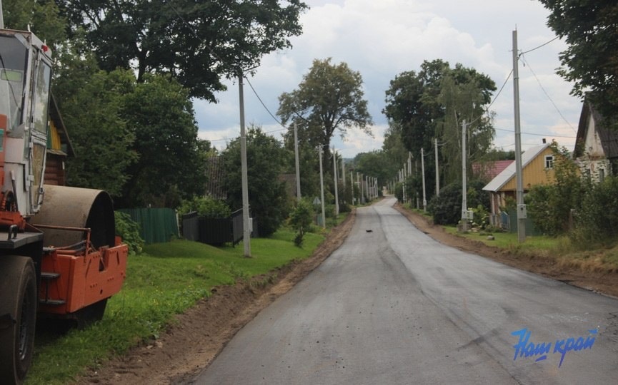 Работники ДРСУ-136 обновляют асфальтовое покрытие в деревне Великое Село.